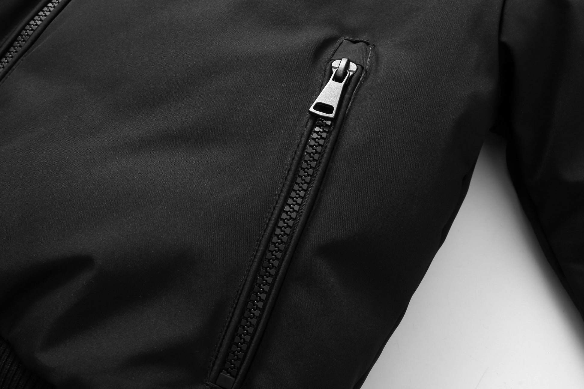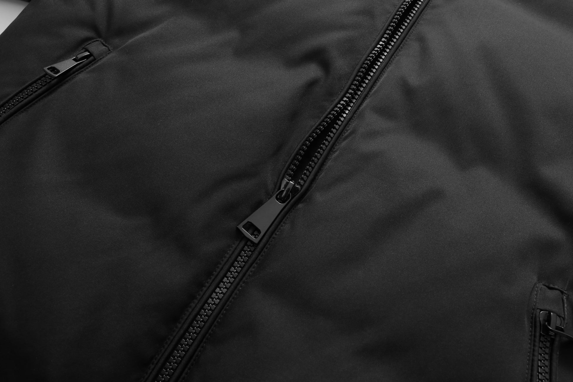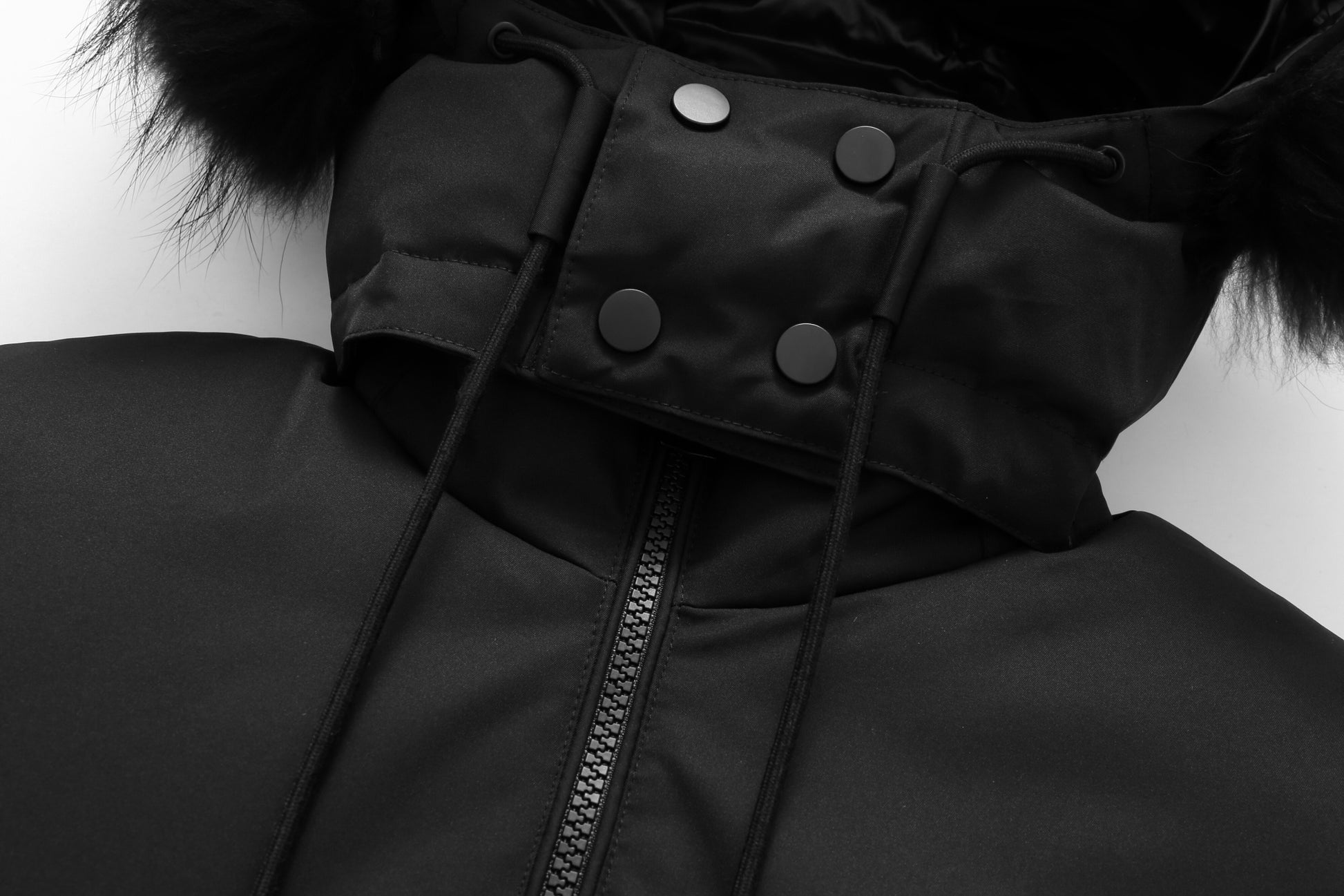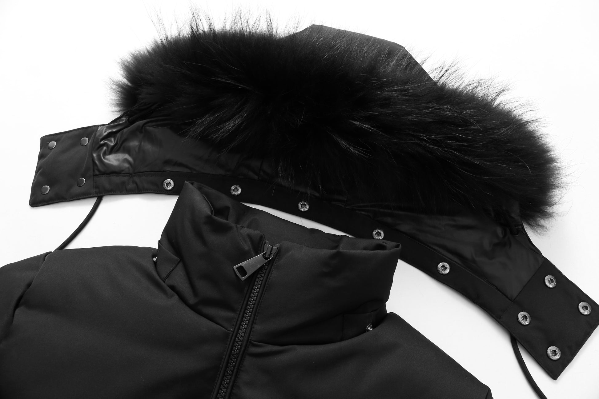 This matte black down coat features a heavy, fur-lined interior for exceptional warmth. Its sleek design is complemented by neat drawstrings, offering a refined and polished appearance.