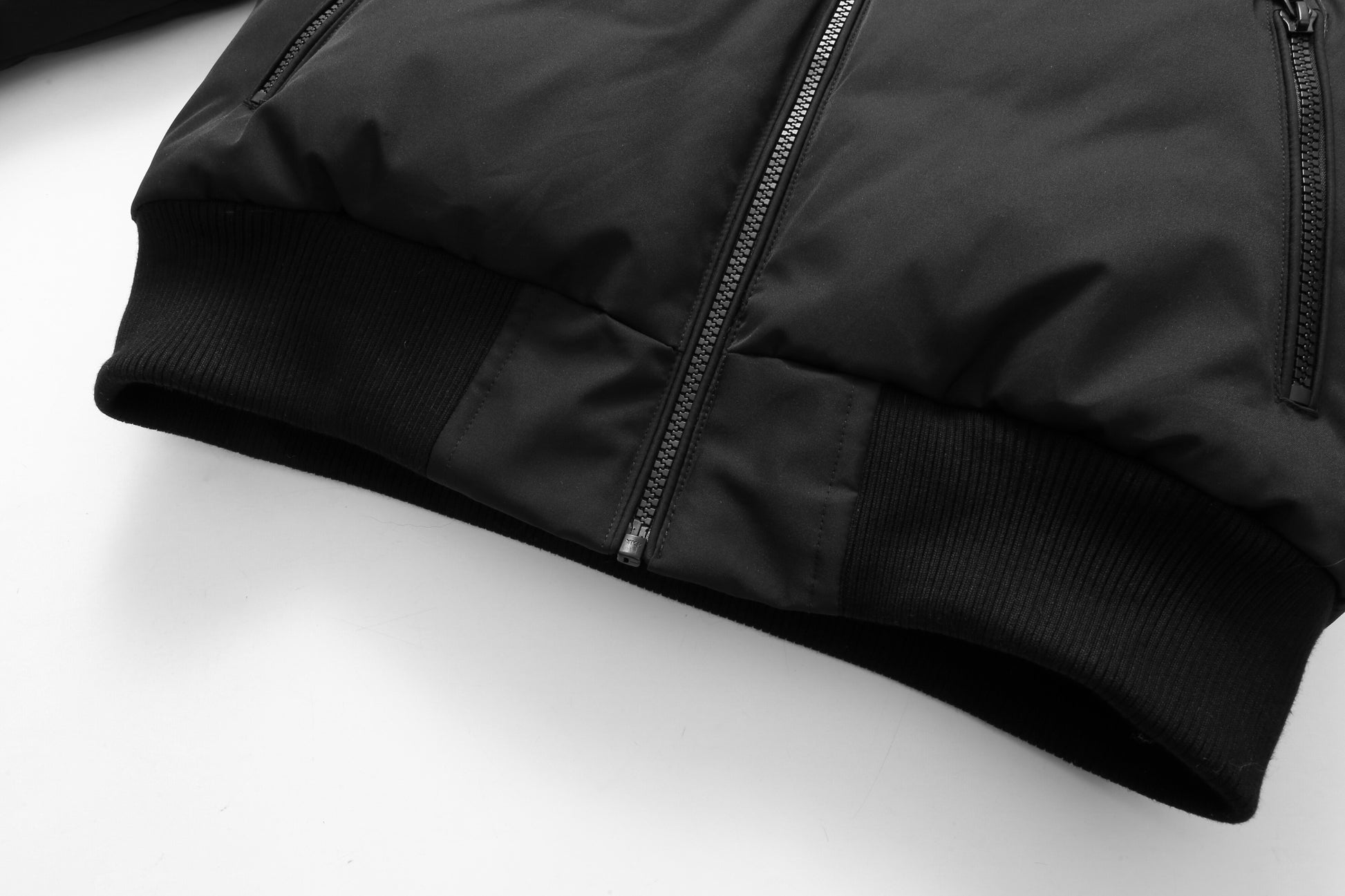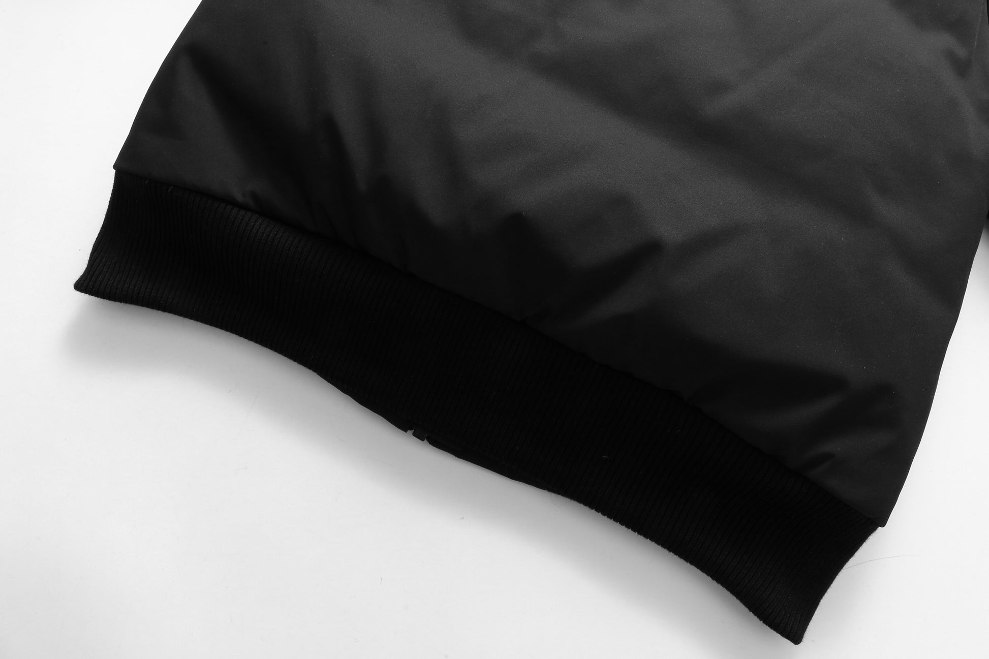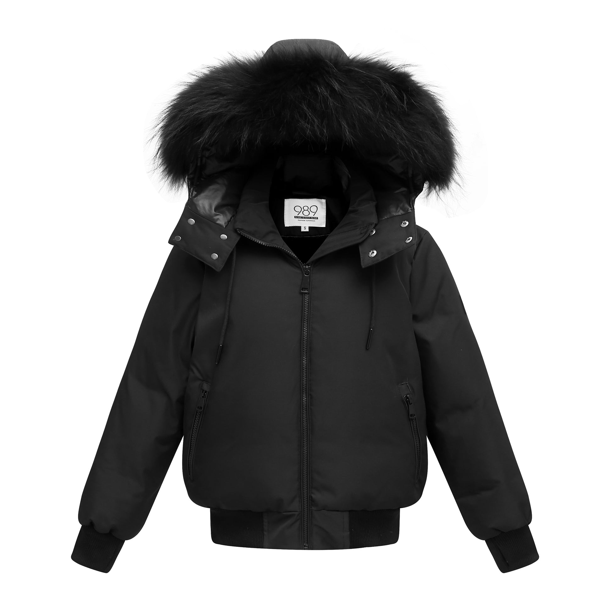 This matte black down coat features a heavy, fur-lined interior for exceptional warmth. Its sleek design is complemented by neat drawstrings, offering a refined and polished appearance.
