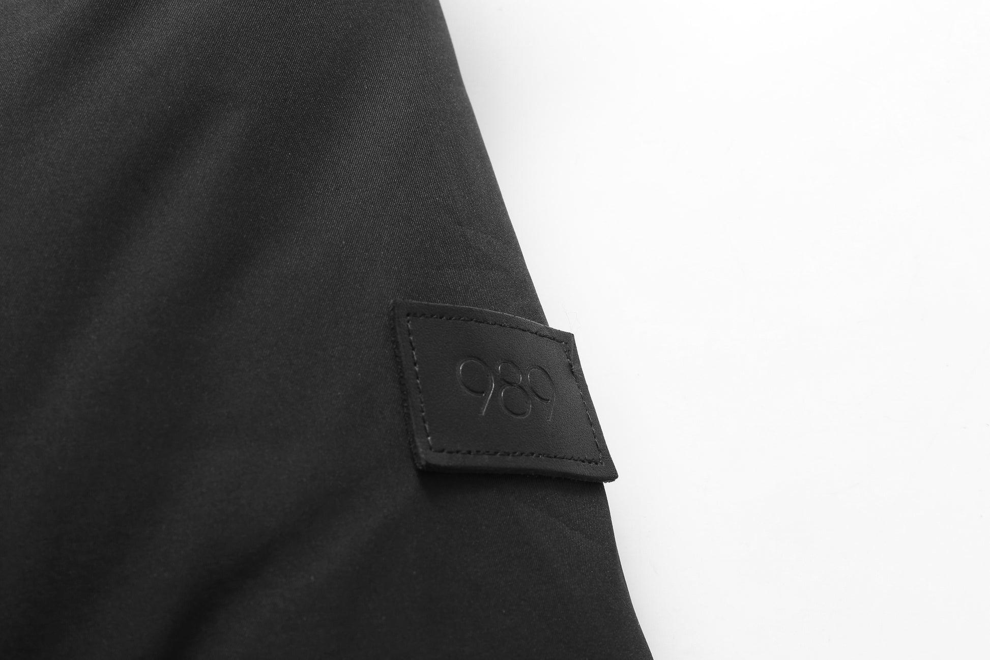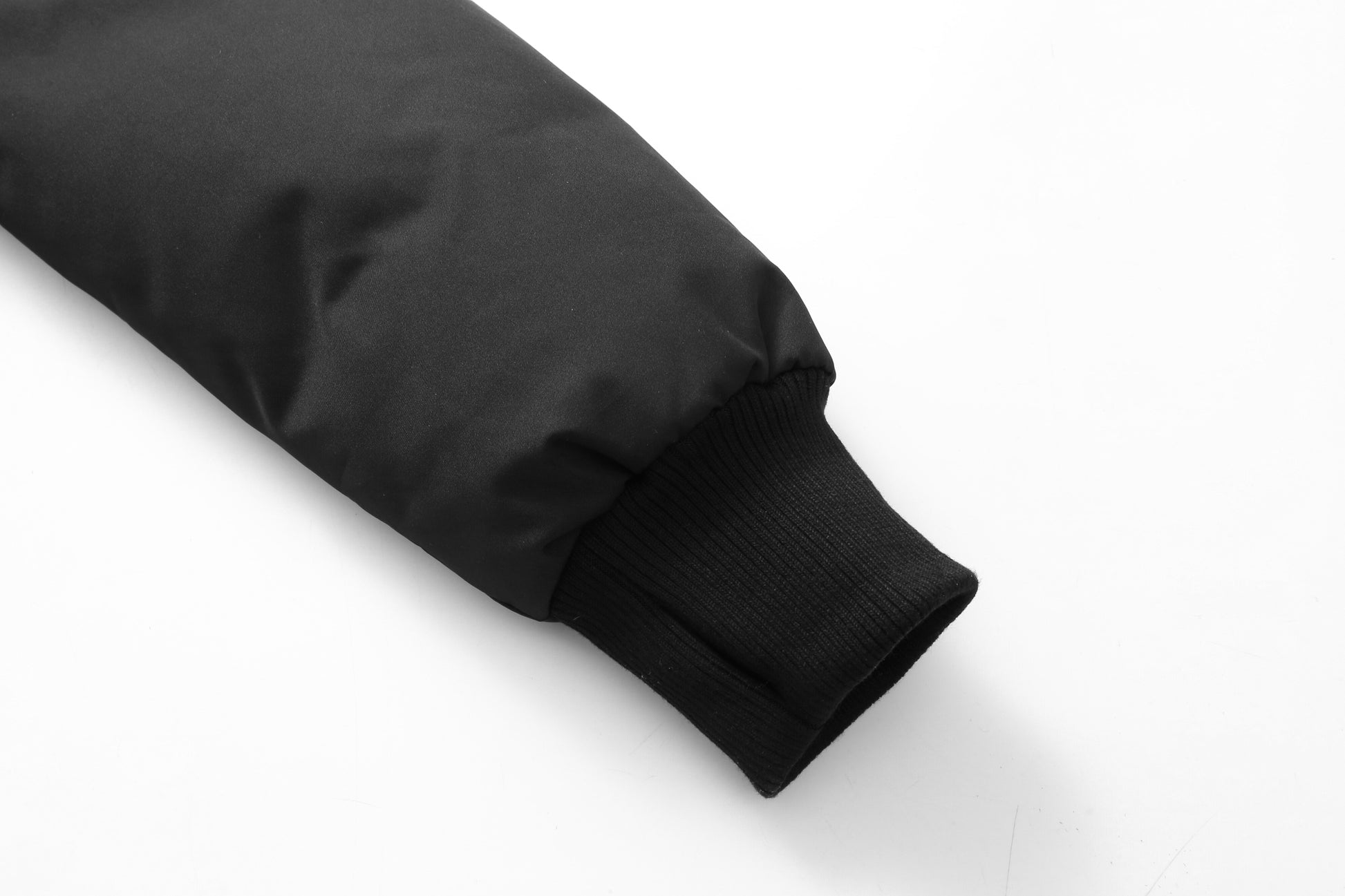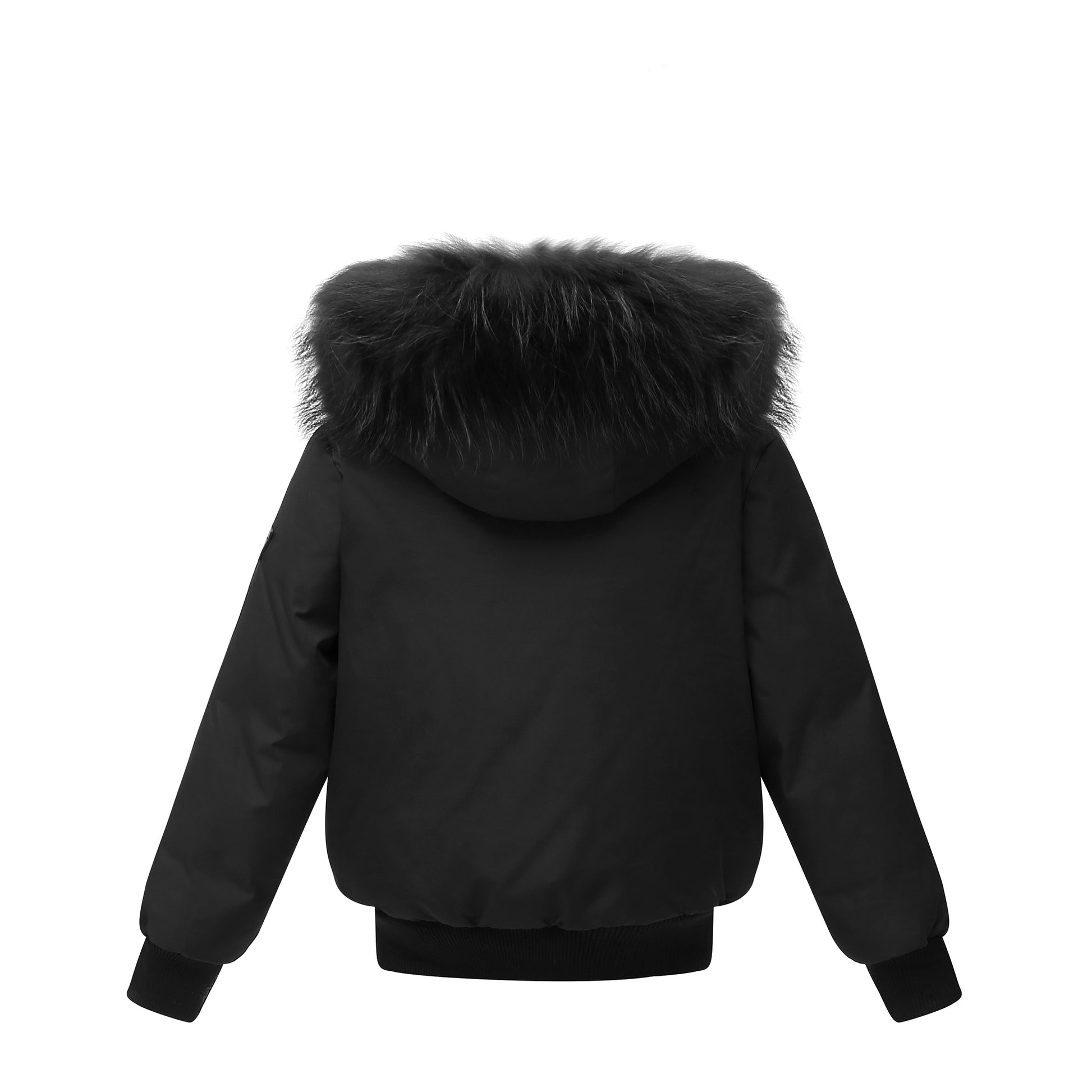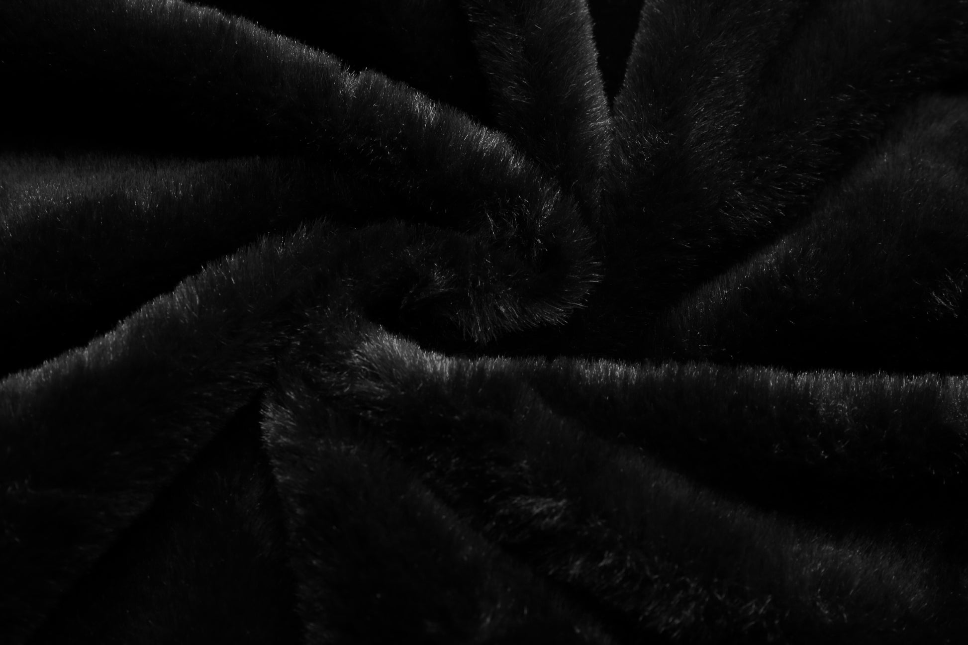 This matte black down coat features a heavy, fur-lined interior for exceptional warmth. Its sleek design is complemented by neat drawstrings, offering a refined and polished appearance.