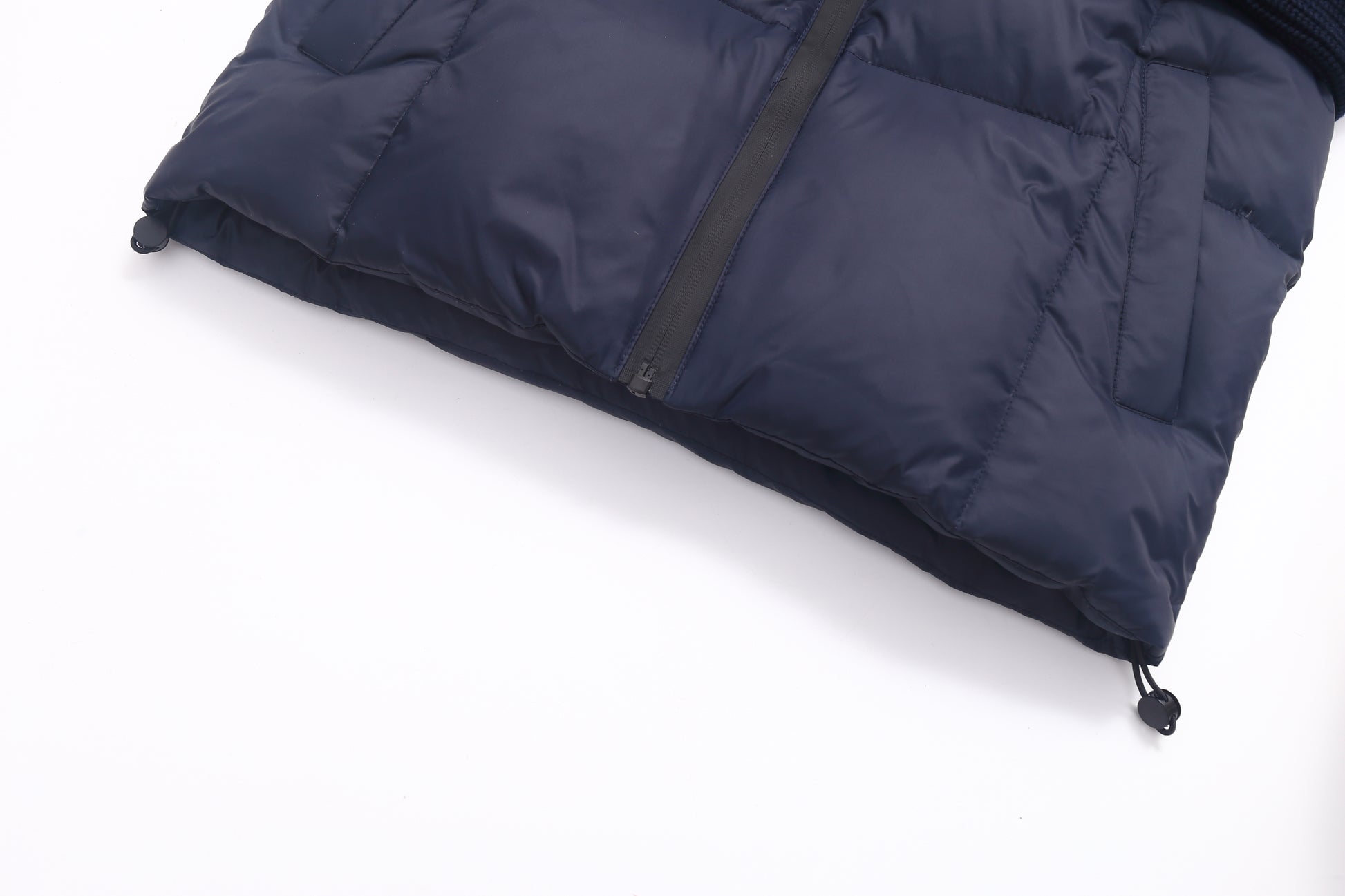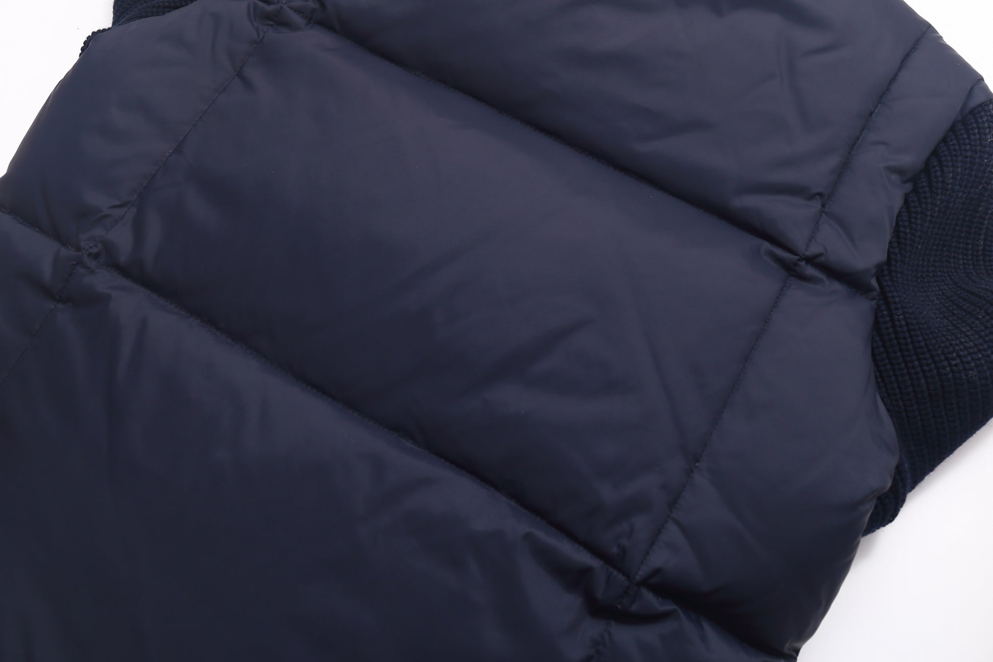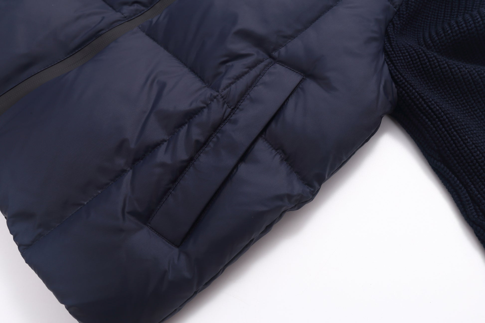 This Black hybrid jacket features knit sleeves and a down-filled center, combining elegance with exceptional style and a flattering fit.