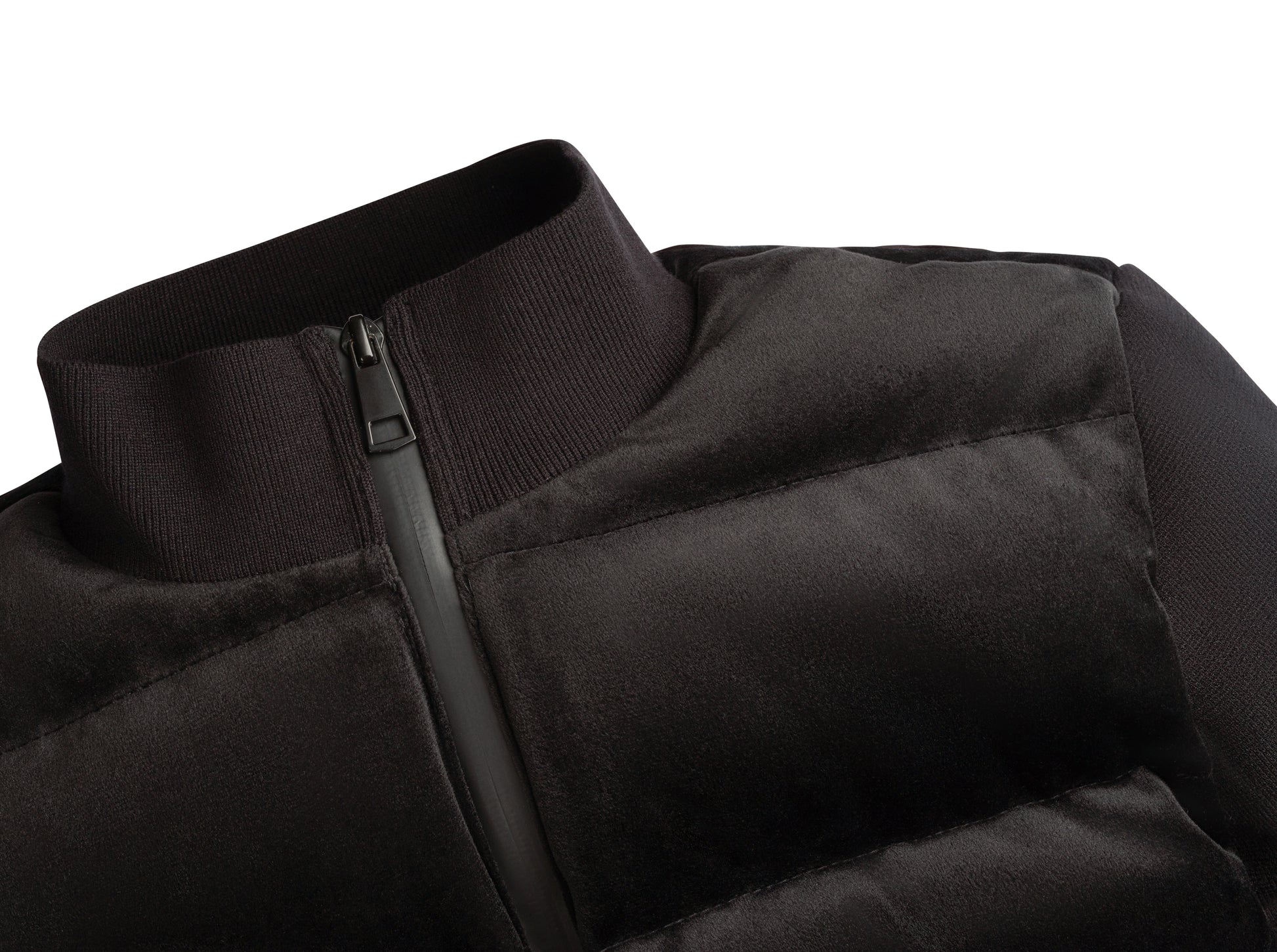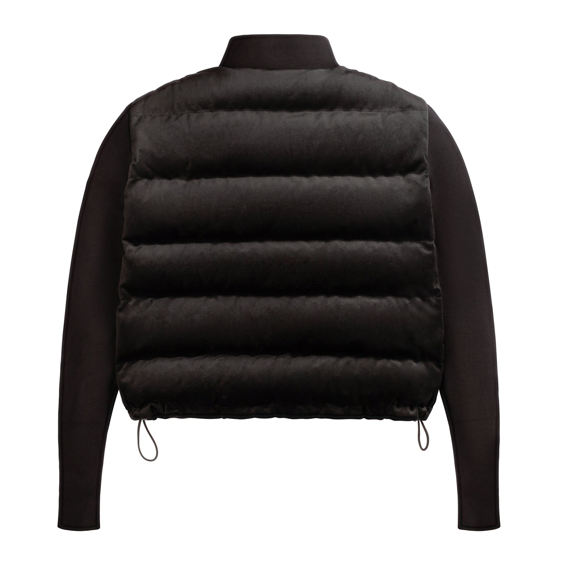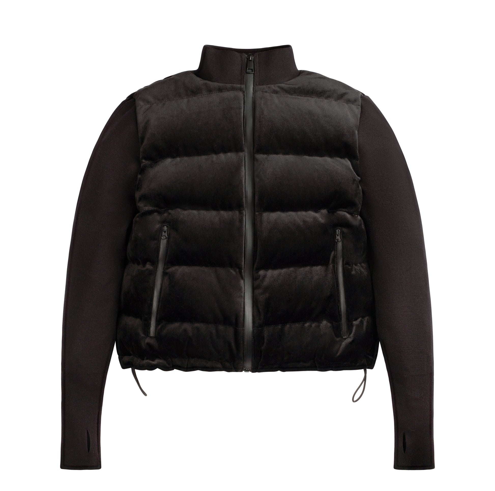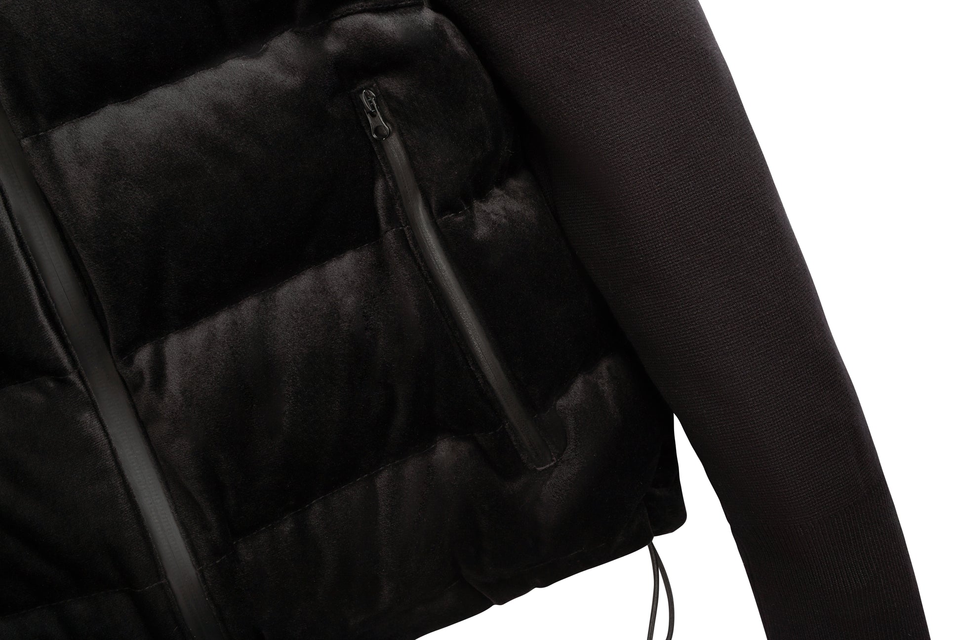 Velvet Glisten combines a soft velvet front with elegant knit sleeves for a stylish and comfortable jacket that adds a refined touch to your look.