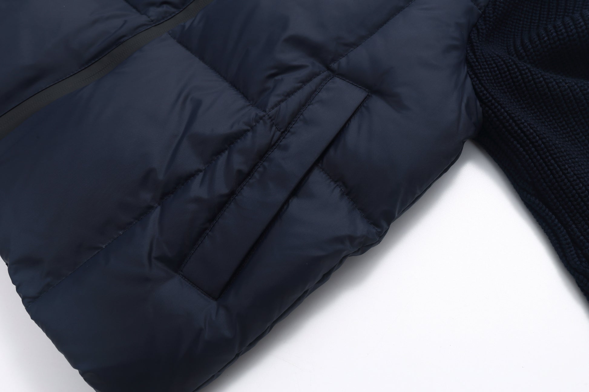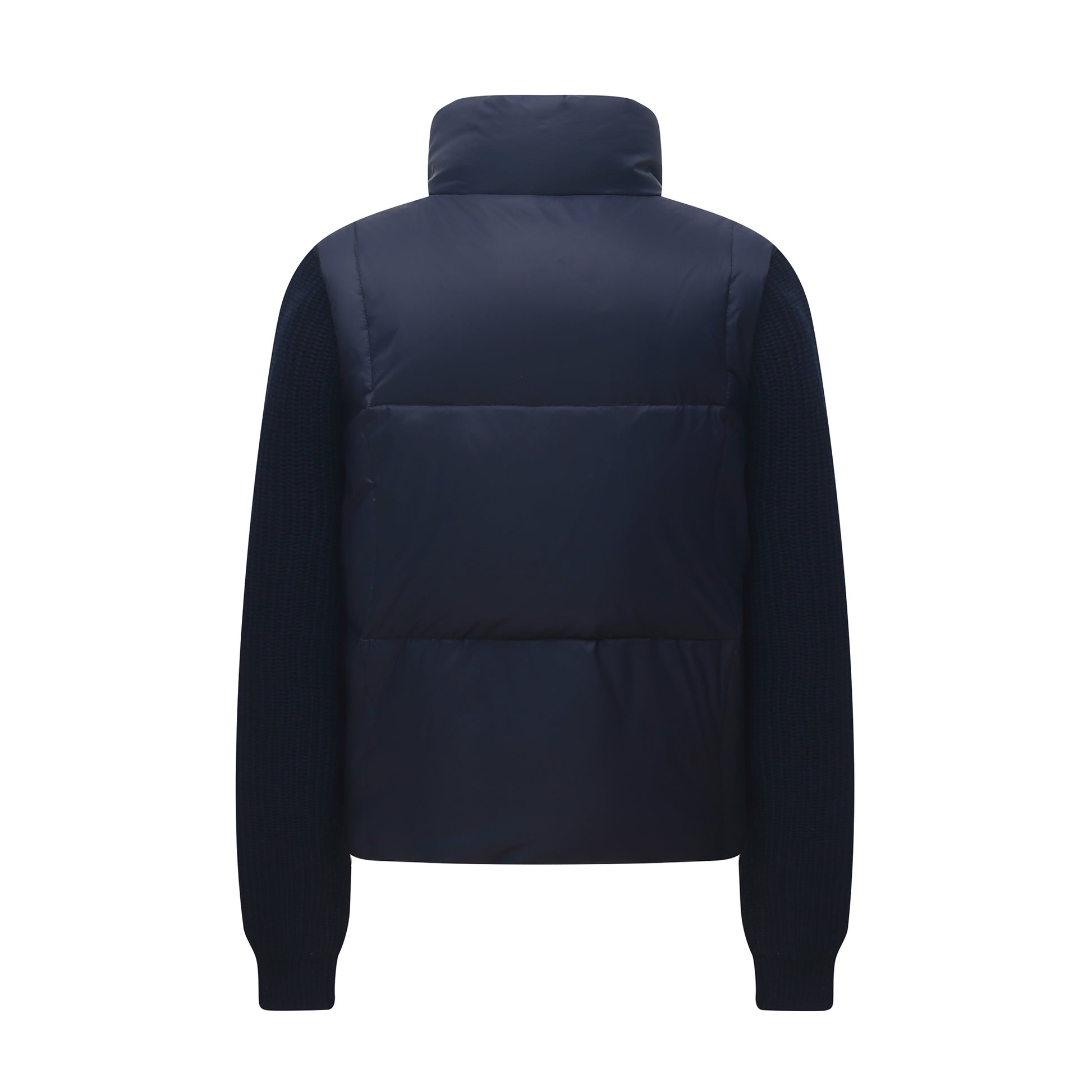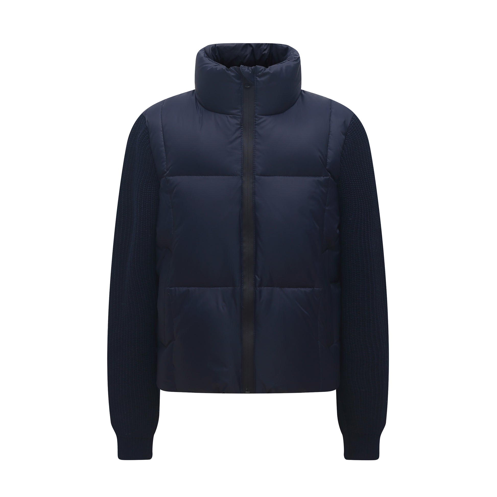 This Navy hybrid jacket features knit sleeves and a down-filled center, combining elegance with exceptional style and a flattering fit.