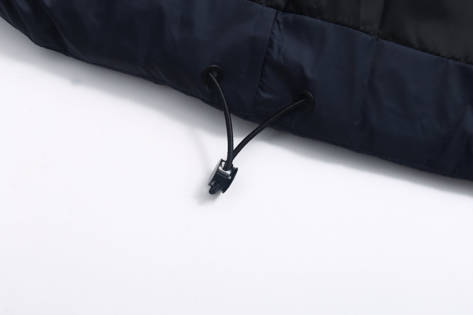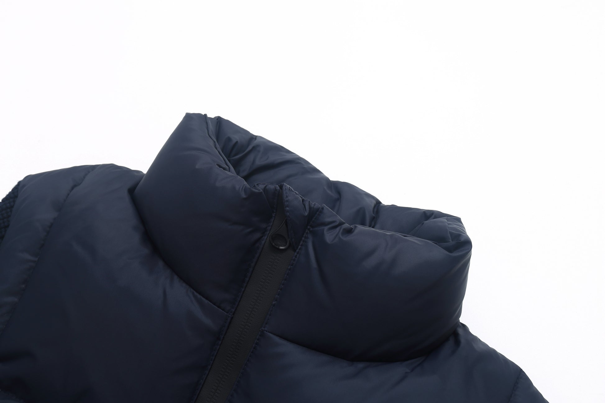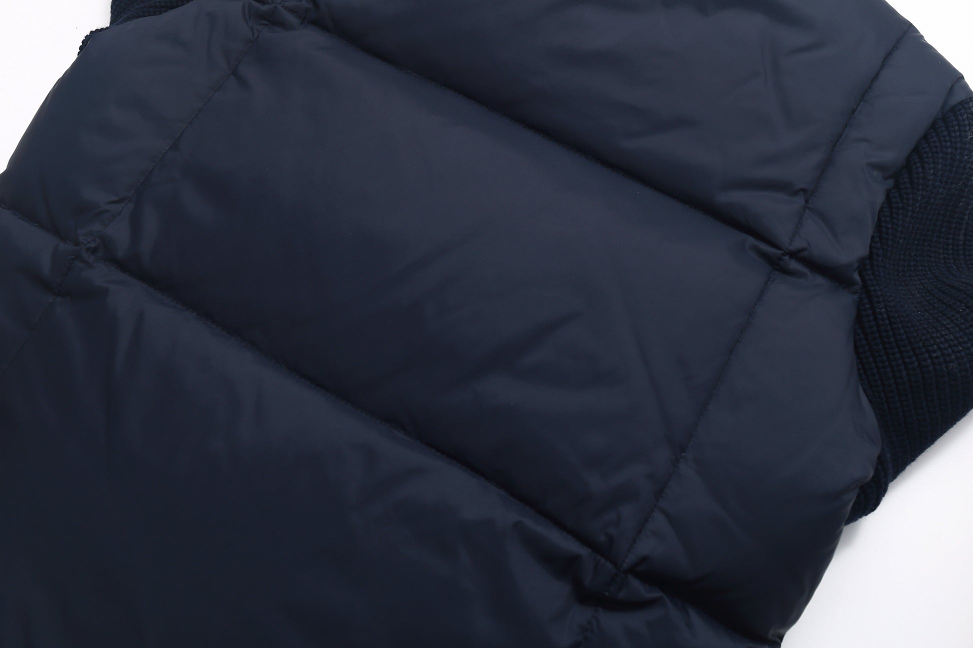 This Navy hybrid jacket features knit sleeves and a down-filled center, combining elegance with exceptional style and a flattering fit.
